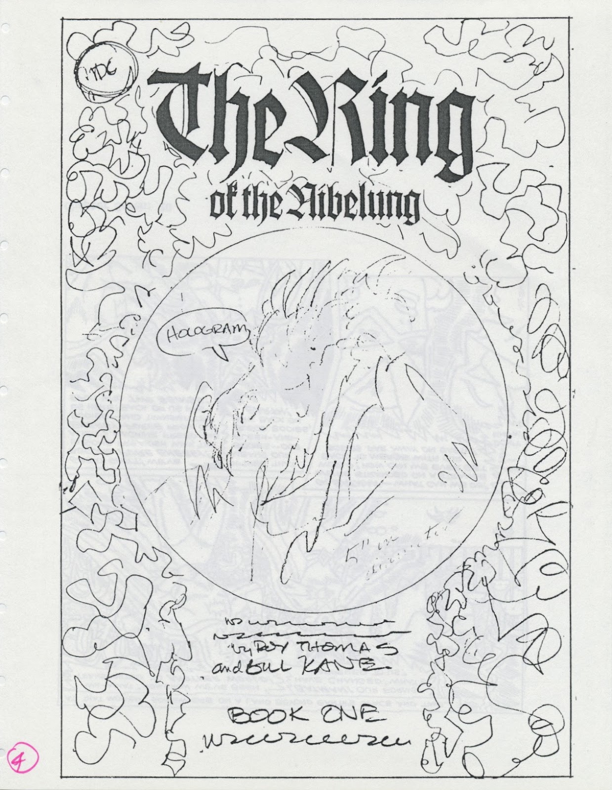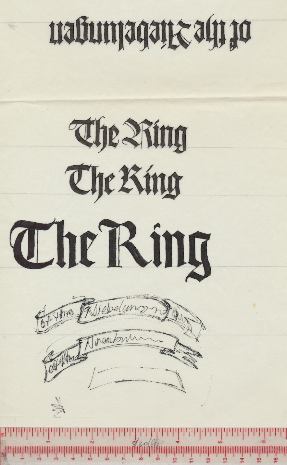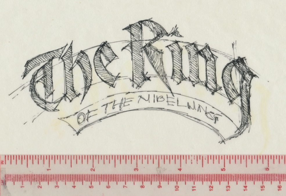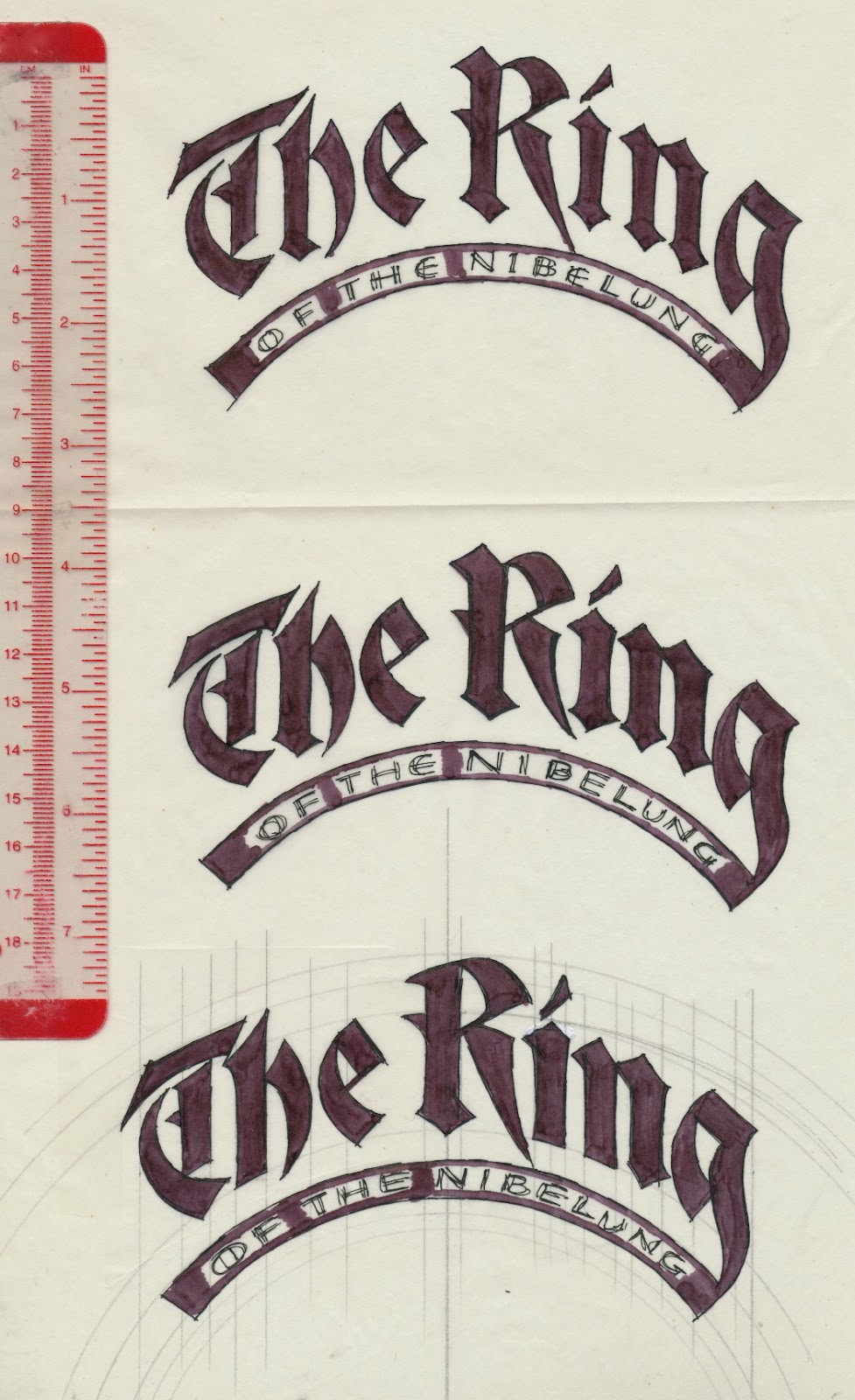 On August 3, 1989, I had a meeting at DC Comics with editor Andy Helfer and designer Curtis King to discuss a logo for the four-part mini-series, The Ring of the Nibelung, a graphic novel adaptation of Richard Wagner's opera by Roy Thomas and Gil Kane. In the title, “The Ring” was to be larger than “of the Nibelung”. We decided on blackletter for the logo and a circular design for the cover.