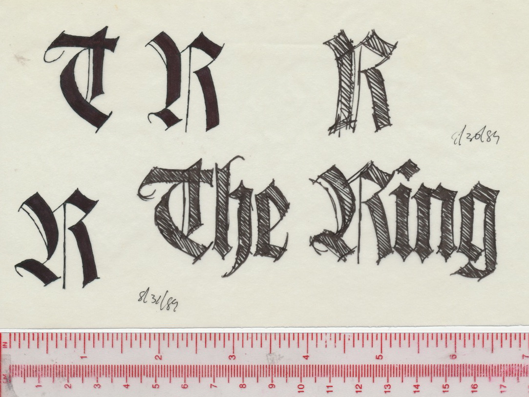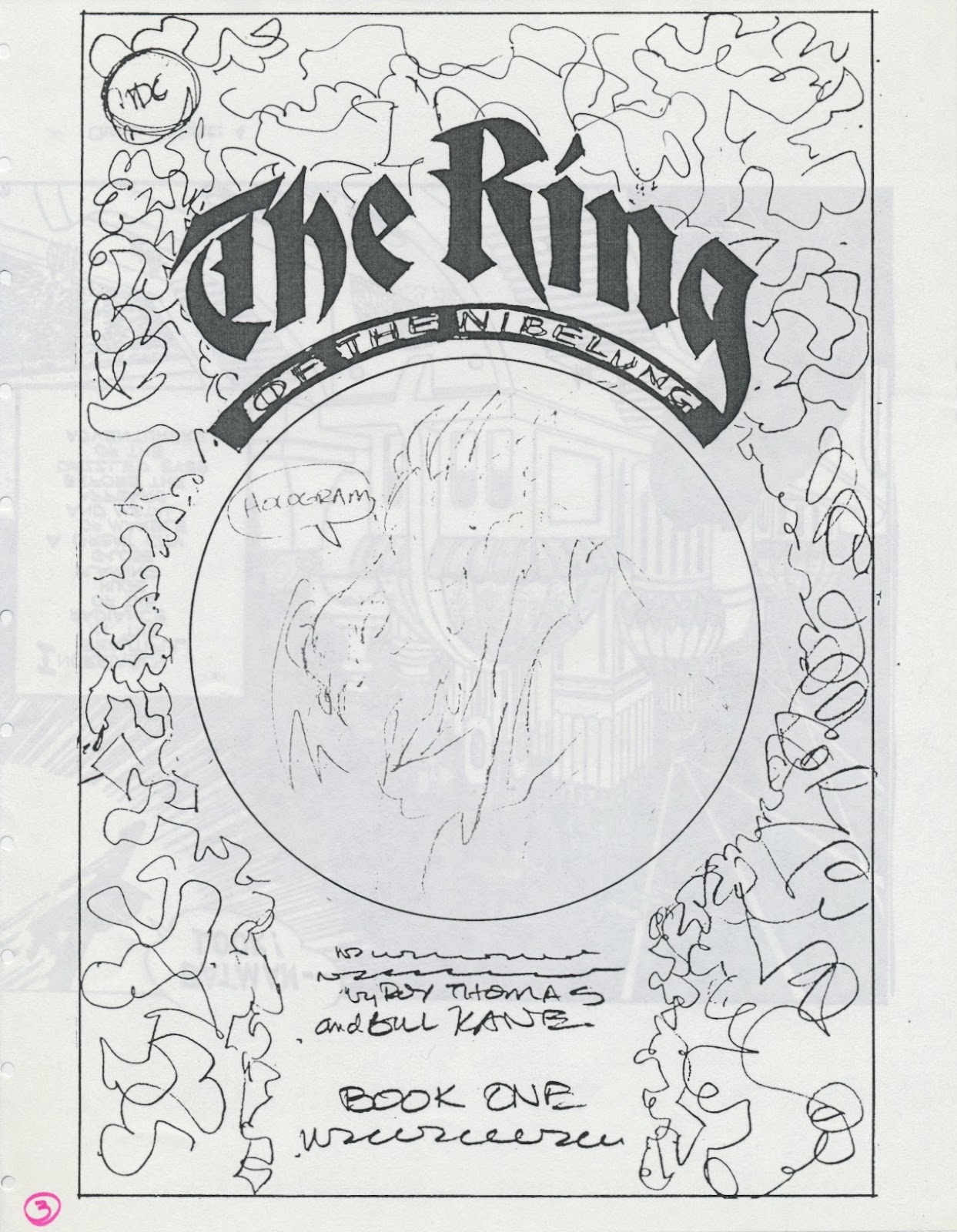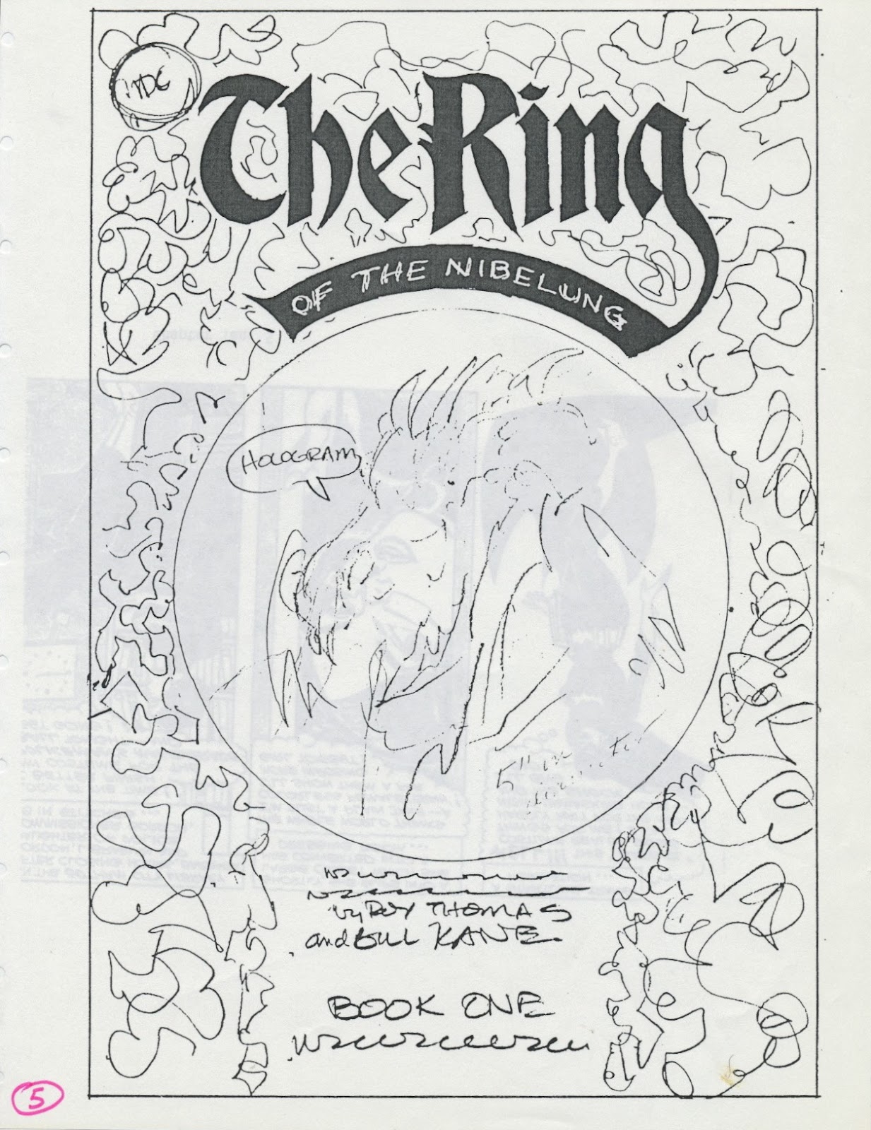 On August 3, 1989, I had a meeting at DC Comics with editor Andy Helfer and designer Curtis King to discuss a logo for the four-part mini-series, The Ring of the Nibelung, a graphic novel adaptation of Richard Wagner's opera by Roy Thomas and Gil Kane. In the title, “The Ring” was to be larger than “of the Nibelung”. We decided on blackletter for the logo and a circular design for the cover.