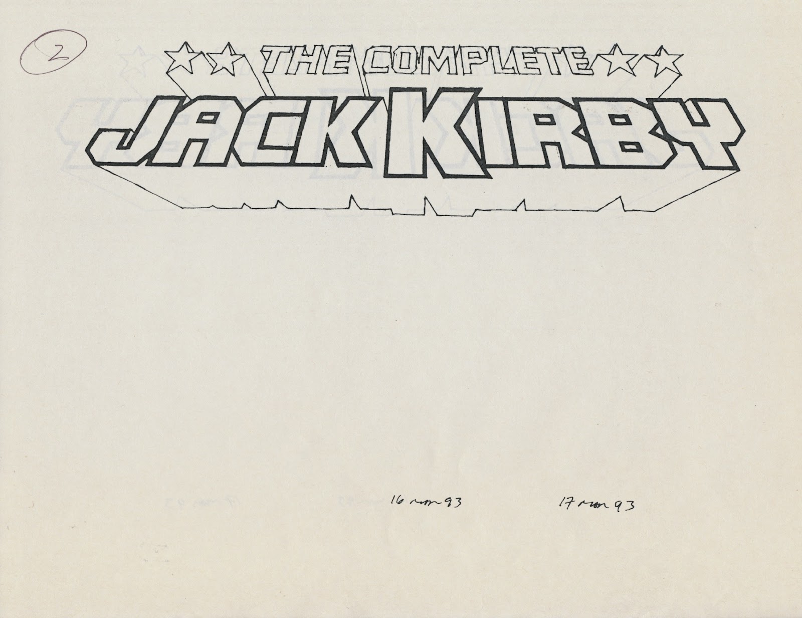 Greg Theakston, publisher of Pure Imagination, asked me to design the logo for his new series, The Complete Jack Kirby, a collection of Kirby’s illustrations, comic strips and early comic book work. The logo sketches were developed over two days, March 16 and 17, 1993.