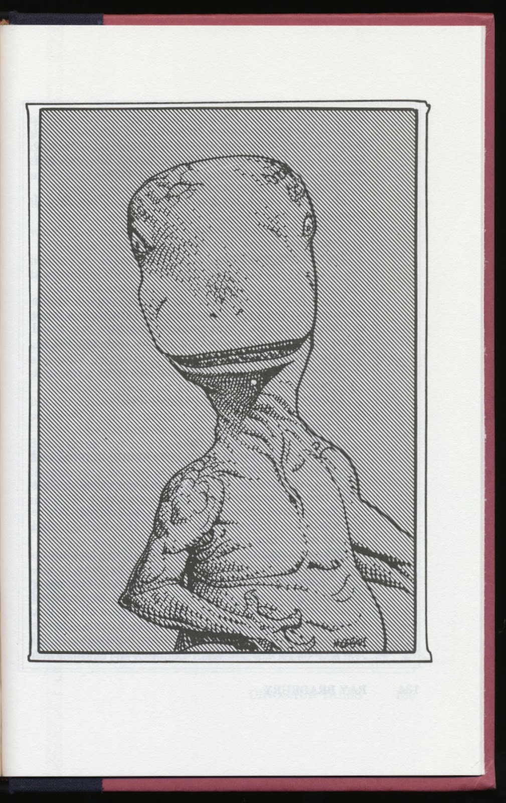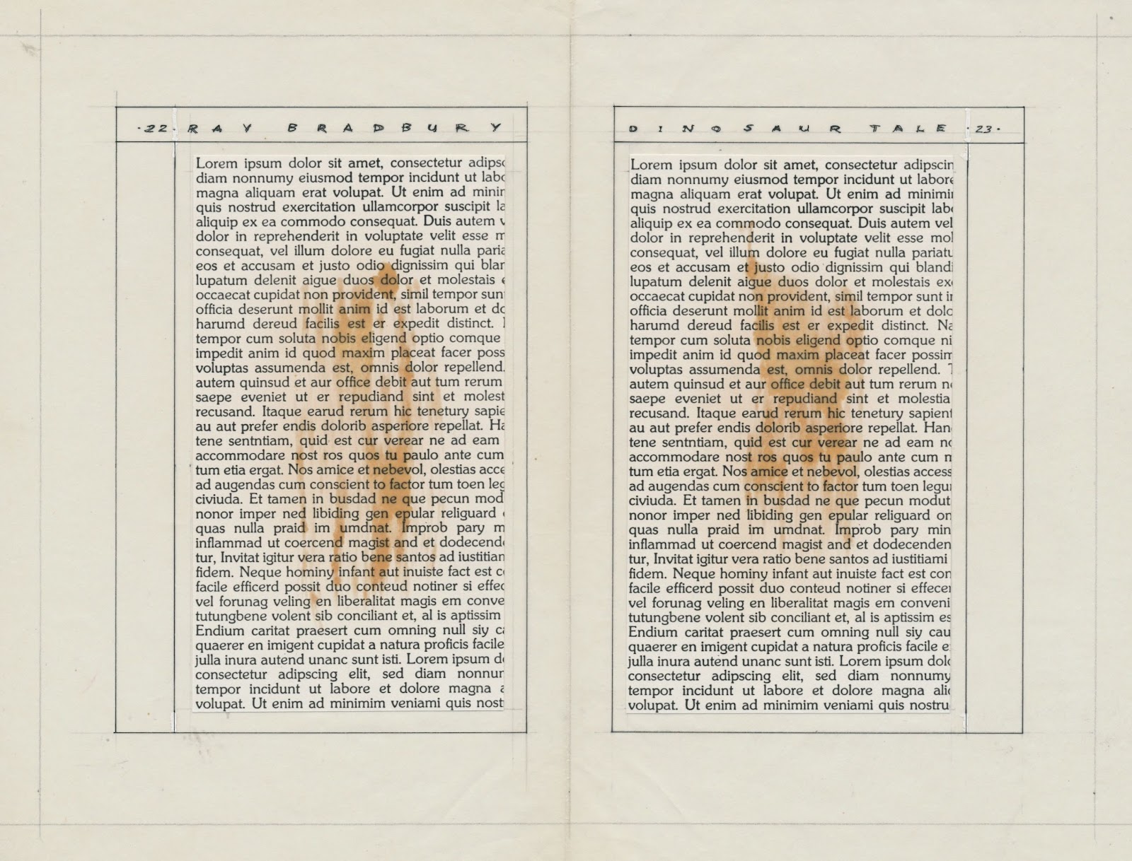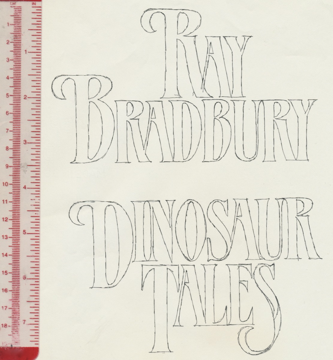 In this design, each word was stacked on its own line. The red perspective and arc guide lines were added next. A tighter drawing was made on velum.
