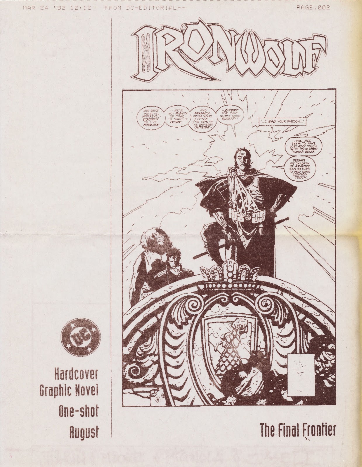 Around 10 o’clock in the morning on March 23, 1992, DC designer Robbin Brosterman called and offered the Ironwolf graphic novel logo to me. I accepted. The next day a two-page fax arrived. The first page was her cover layout and the second was an ad for the book with an Ironwolf logo by Todd Klein from 1987. (The book collected the three Ironwolf stories from the 1972 Weird Worlds issues 8, 9, and 10.) I called Robbin and we discussed the logo design. She wanted the logo to match the width of the box for the art. The lettering should be tall and condensed, and perhaps similar to black letter or with elements from Klein’s logo. On the fax, I made a note that sketches were due April 3.