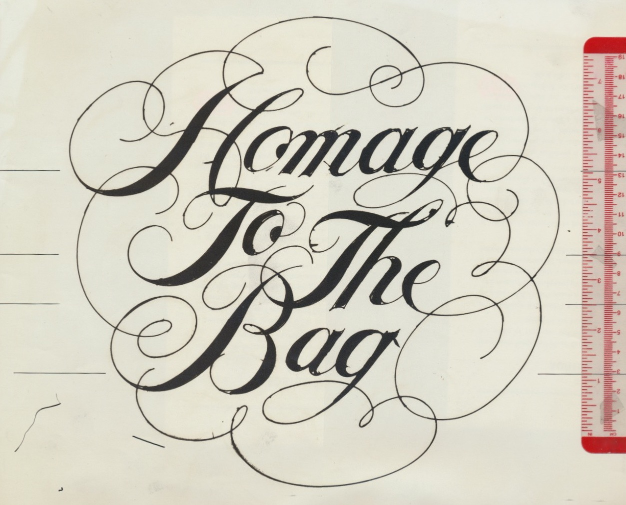 The Center contacted the Graphic Design Workshop for a poster design. Tom Hall assigned the project to me. After a number of sketches and discussions, Hall suggested Spencerian script on a paper bag. Below is a detail of the comp lettering on a paper bag which was shown to the Center for approval.