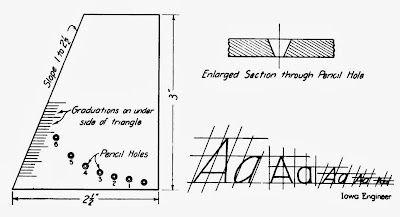 A series of holes in the disc enable the user to draw with accuracy and ease the guide lines for three systems of lettering and for letters of any height. By turning the instrument, the bar can be used as an angle enabling one to draw guide lines at either 75 or 68 degrees. Altogether it is a compact, convenient and practical instrument.