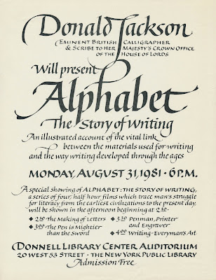 Alice Koeth created the August 1981 flyer for the Donald Jackson event at the Donnell Library in New York City. After Jackson made his presentation, he signed copies of his book, The Story of Writing, on the front endpaper. Several people were waiting to have their book signed when the library closed at 8 o’clock. Outside the library, the remaining people assembled in the parking lot where Jackson commandeered the parking attendant’s booth and finished signing the books. I gave him my full name but he wrote my initials, A J.