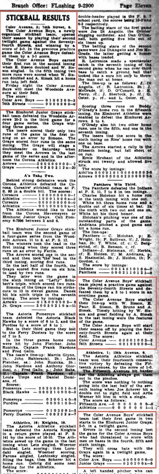 The Coler Avenue Boys, a newly organized stickball team, opened their season by playing their second twilight game against the Seventy-fourth Streets and winning by a score of 3–0….